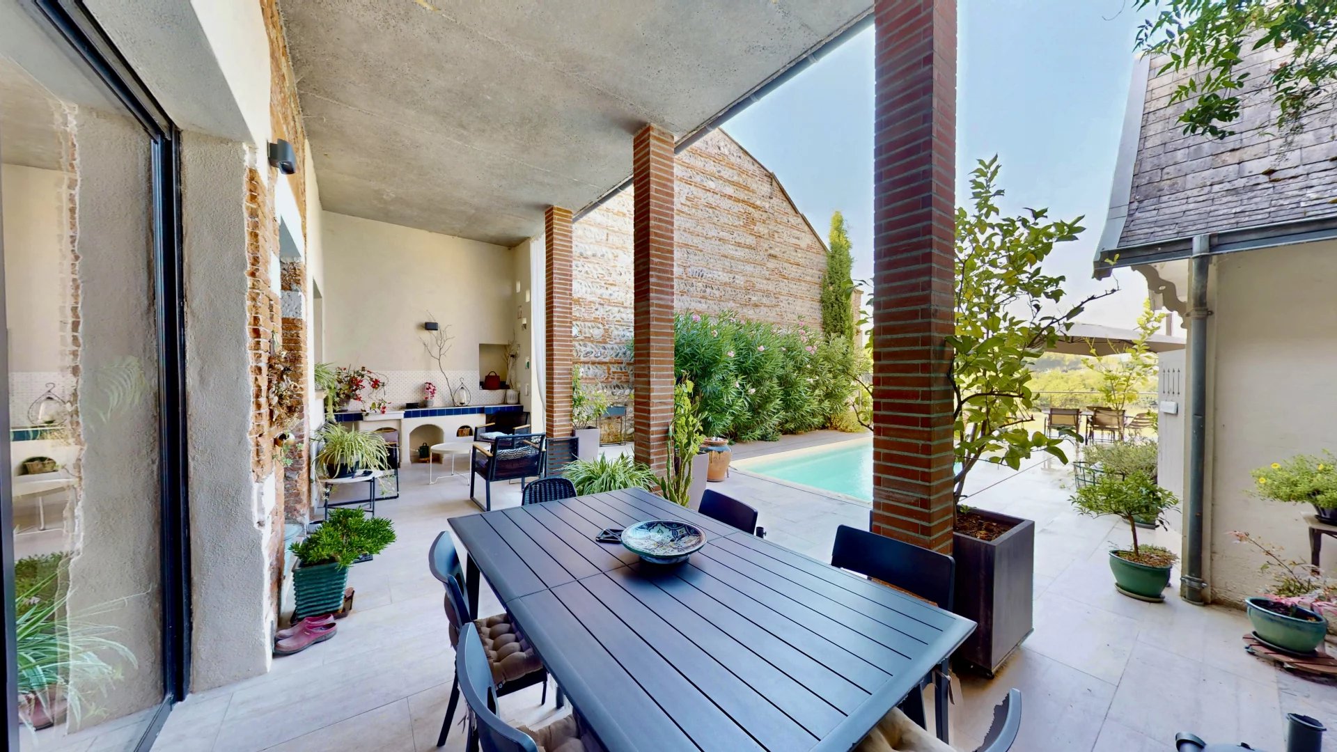 Cet ensemble donne accès à une vaste terrasse d’environ 150 m² avec piscine, idéale pour les moments de détente et de convivialité. Deux chambres complètent également ce niveau.