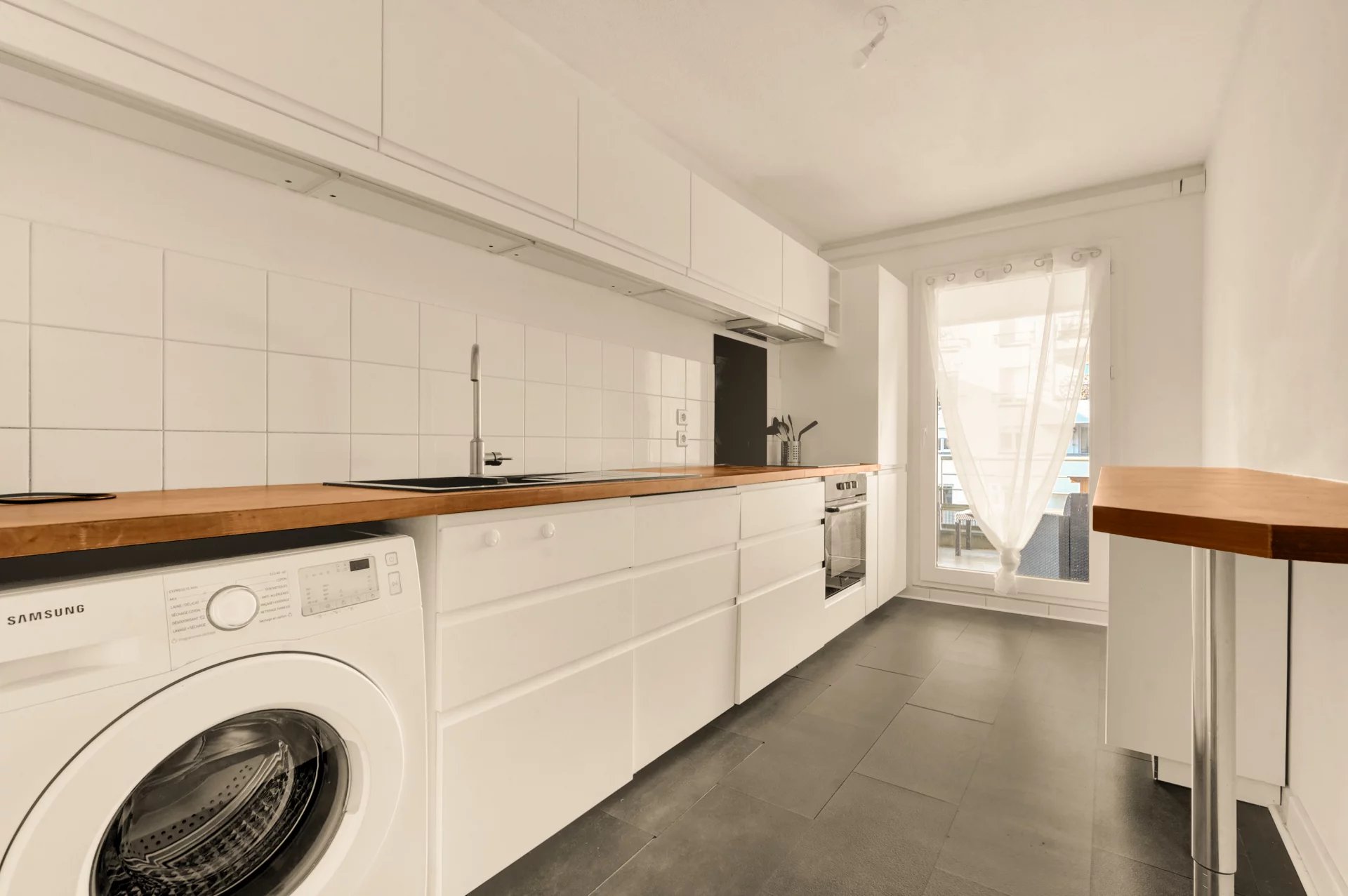 La cuisine est séparée, et l’espace nuit se compose de deux chambres avec placards ainsi que d’une salle d’eau séparée des toilettes.