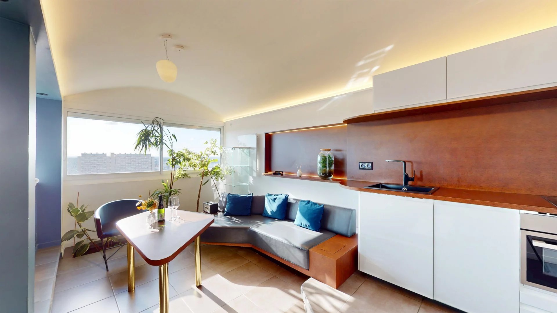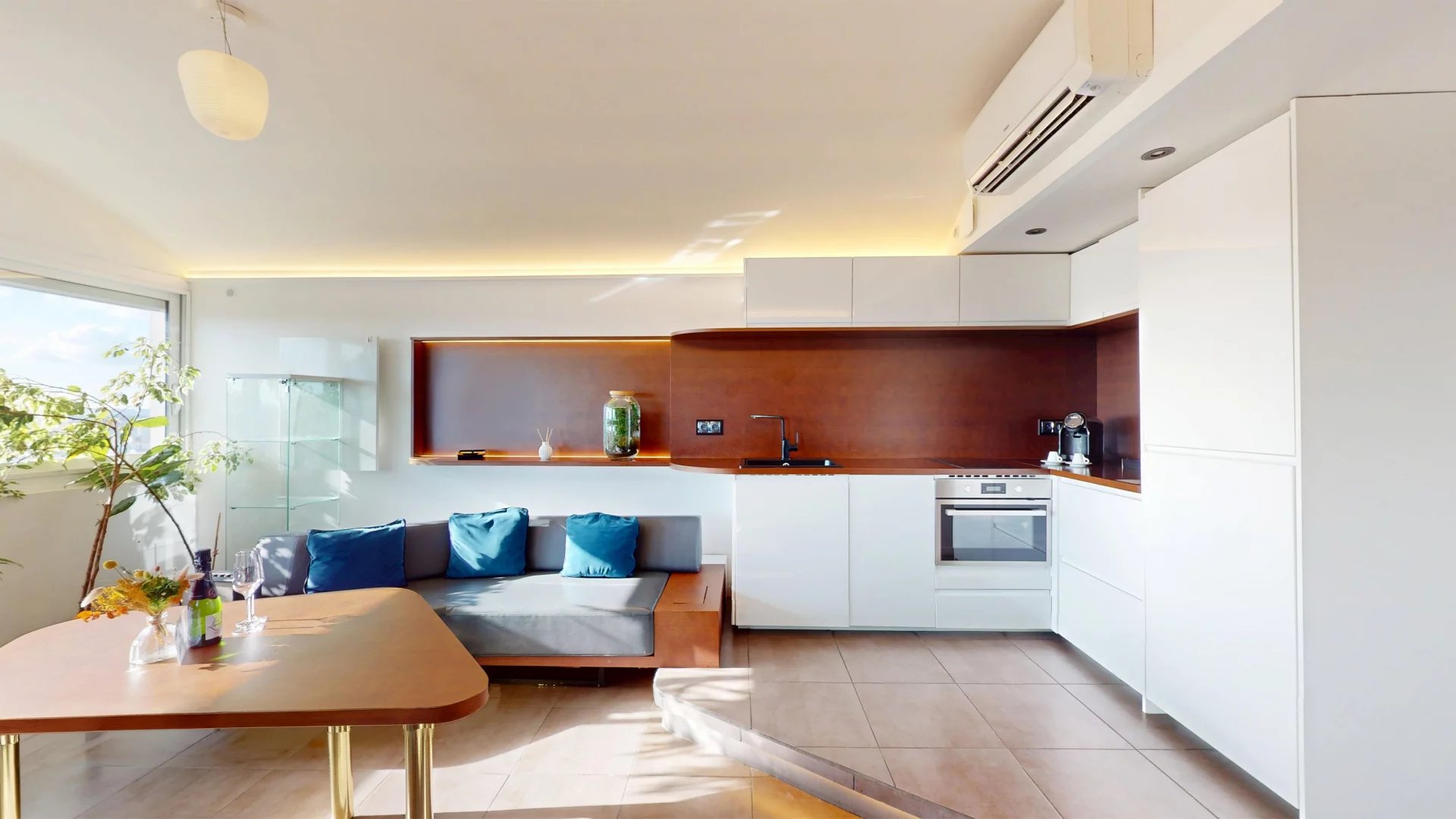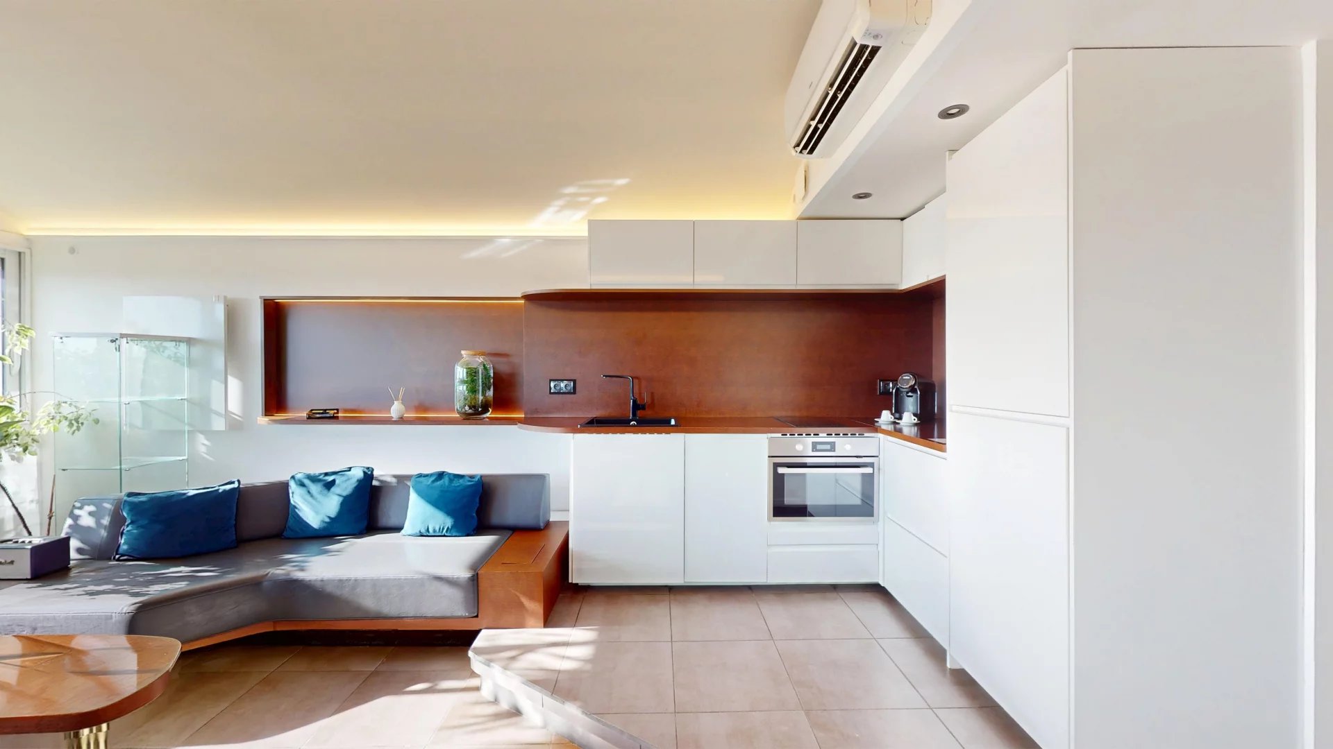 Une cuisine ouverte entièrement équipée aux finitions soignées et des rangements optimisés viennent compléter ce bien exceptionnel.