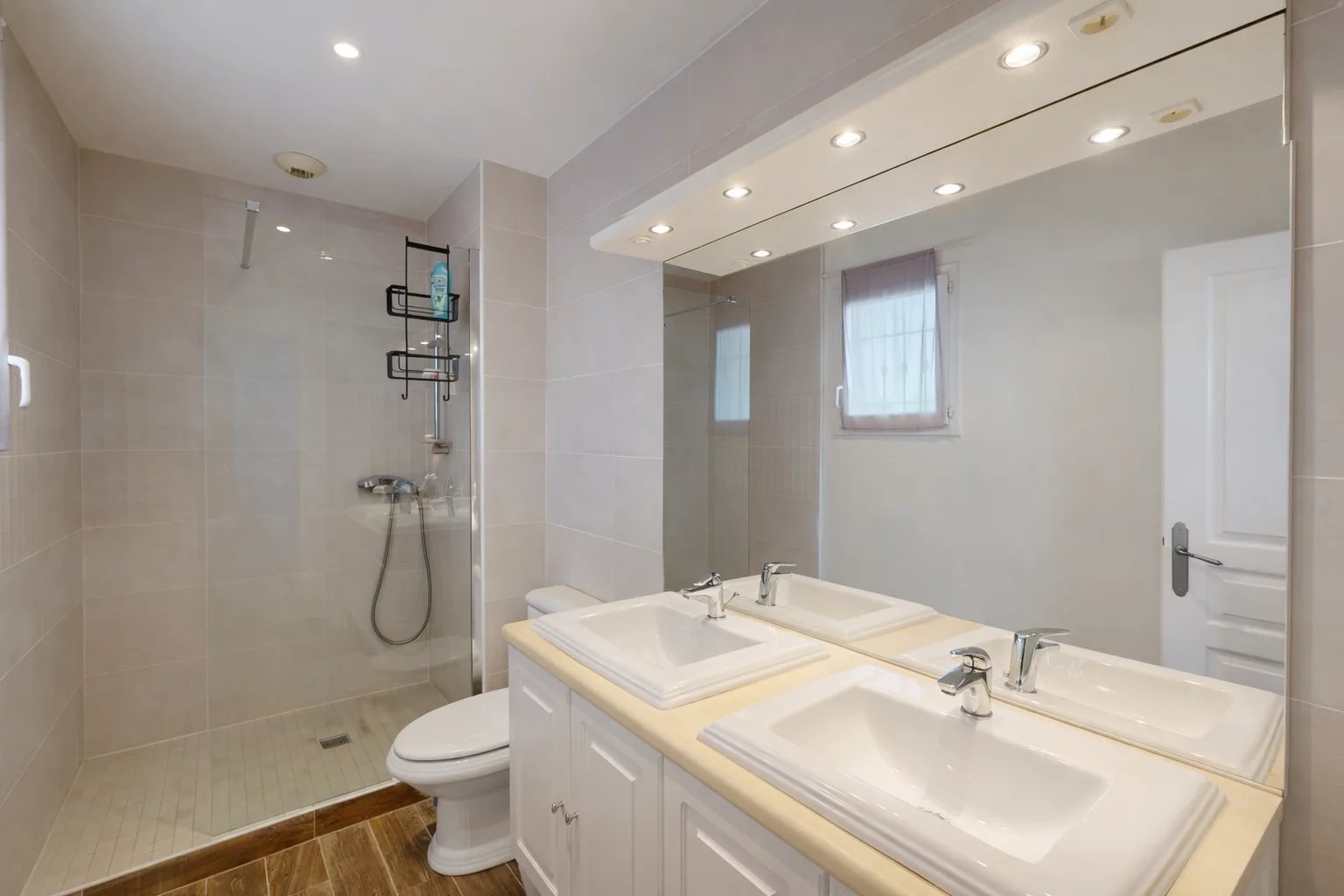 Un séjour spacieux avec une cuisine fermée, 5 chambres, 3 salles de bains, 3 WC et une buanderie.